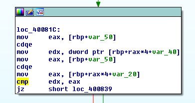 An example is shown from the r200 binary below where a “cmp edx,eax” instruction at address 0x40082e is used to verify the encoding of the input byte matches the expected output value.